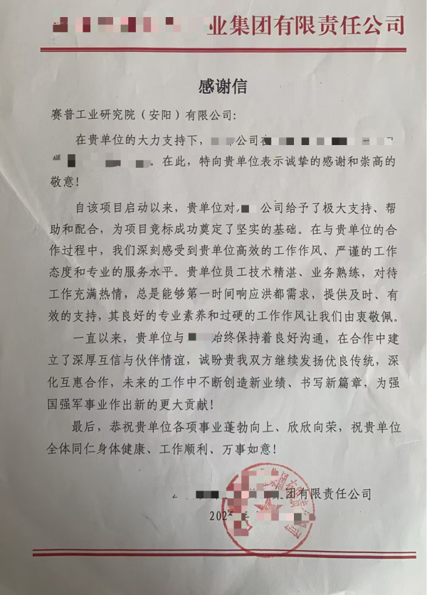 近期,賽普工業(yè)研究院(安陽)有限公司(以下簡稱“賽普公司”)再次收到來自客戶的感謝信,客戶對(duì)公司在某特種裝備生產(chǎn)任務(wù)中提供的卓越支持予以高度評(píng)價(jià)。今年以來,賽普公司已多次獲得客戶的書面感謝和電話感謝。贊譽(yù)的背后,是市場(chǎng)與客戶對(duì)賽普公司技術(shù)實(shí)力、服務(wù)品質(zhì)與履約精神的高度認(rèn)可與信賴。